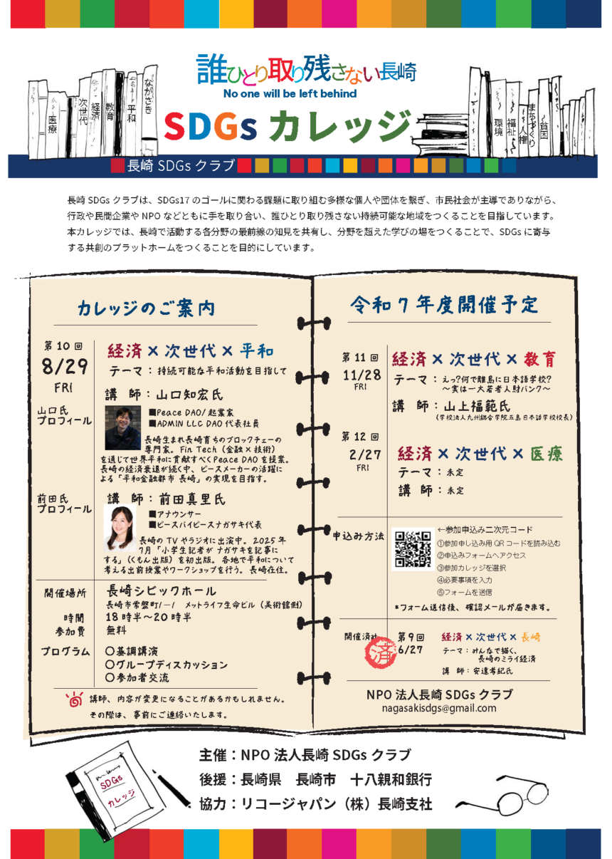 本カレッジでは、長崎で活動する各分野の最前線の知見を共有し、分野を超えた学びの場をつくることで、SDGs に寄与する共創のプラットホームをつくることを目的にしています。